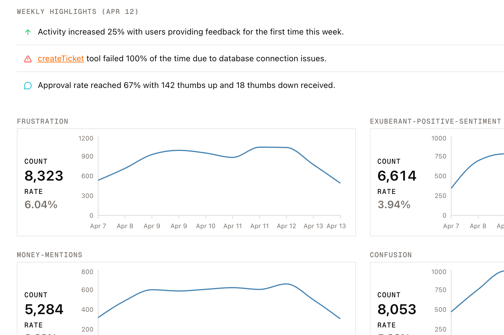 Get a daily digest of what broke, what succeeded, and what users asked most — delivered directly to your Slack channel.