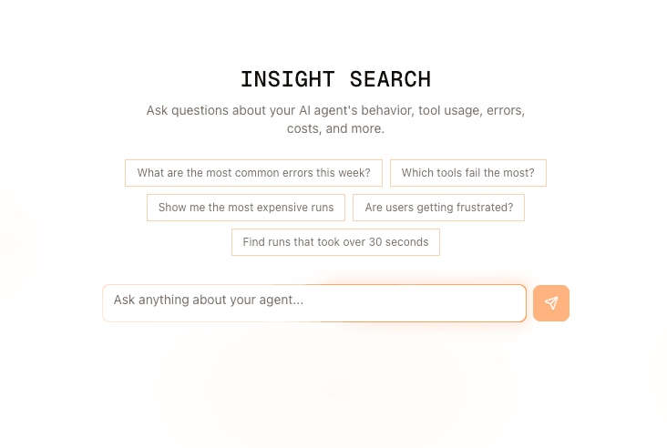 Ask anything about your production conversations — "show me sessions where users got stuck", "find all tool call failures yesterday", "which topics drove the most drop-offs." No SQL, no dashboards.